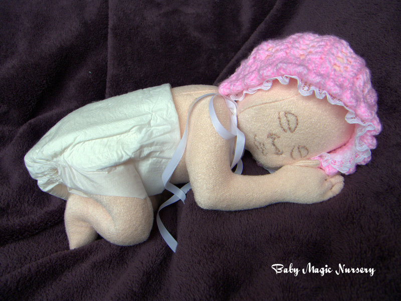 This is my little cloth baby that I have called Sweetheart. She is the correct size and shape of a premature baby born at 30-32 weeks gestation. I have made her entirely from fabric and have embroidered her features.